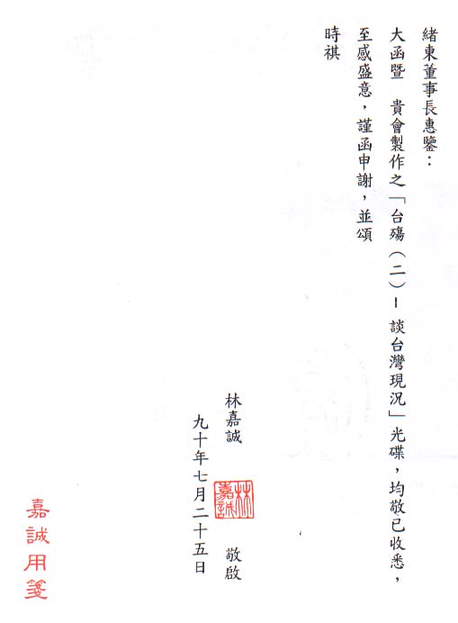 行政院研考會主委林嘉誠先生來函