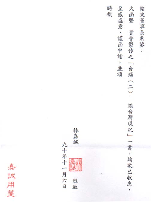 行政院研考會主委林嘉誠先生來函