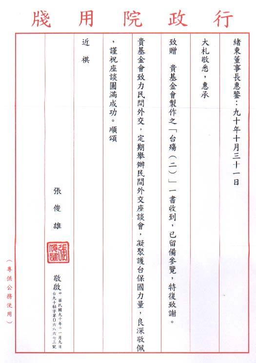 行政院院長張俊雄先生來函