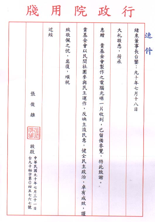 行政院院長張俊雄先生來函