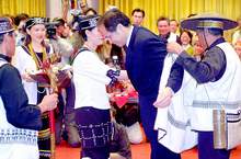 行政院長游錫 (右二)昨日宣布「噶瑪蘭族」正式成為台灣原住民第十一族,噶瑪蘭族人在復名茶會上,由族中長老為游院長穿上噶瑪蘭傳統服裝。(記者鹿俊為攝)