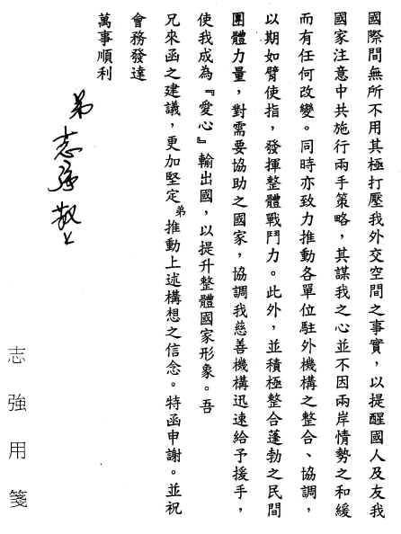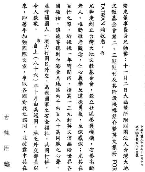 Nov. 10, 1998 --- 外交部長胡志強先生回函