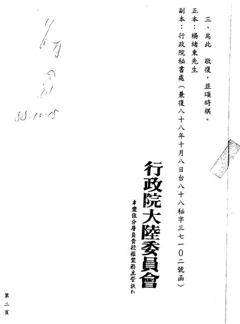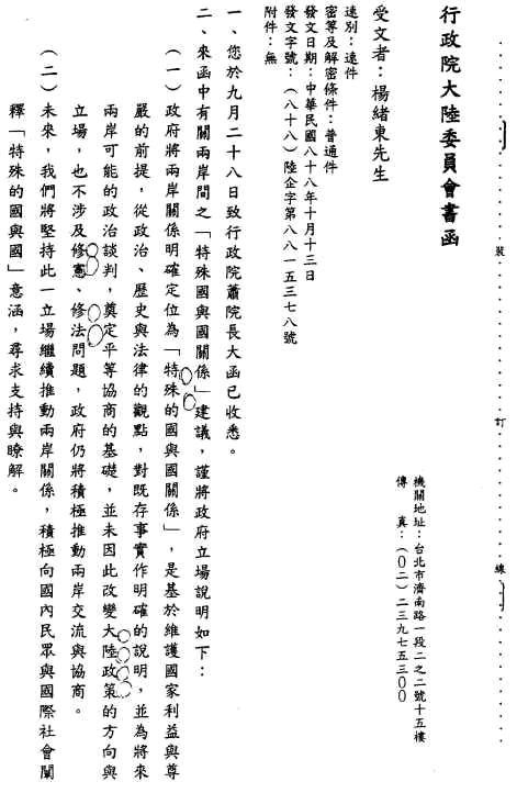 Oct. 13, 1999 --- 行政院大陸委員會回函