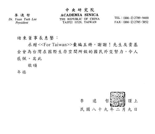 Feb. 9, 2000 --- 中央研究院院長李遠哲先生回函