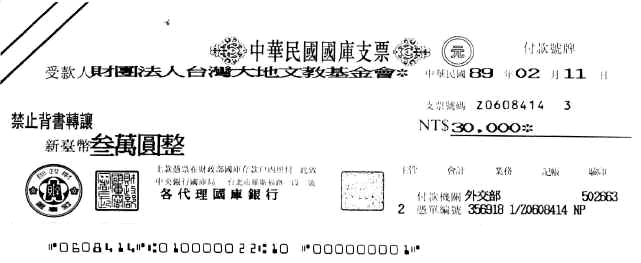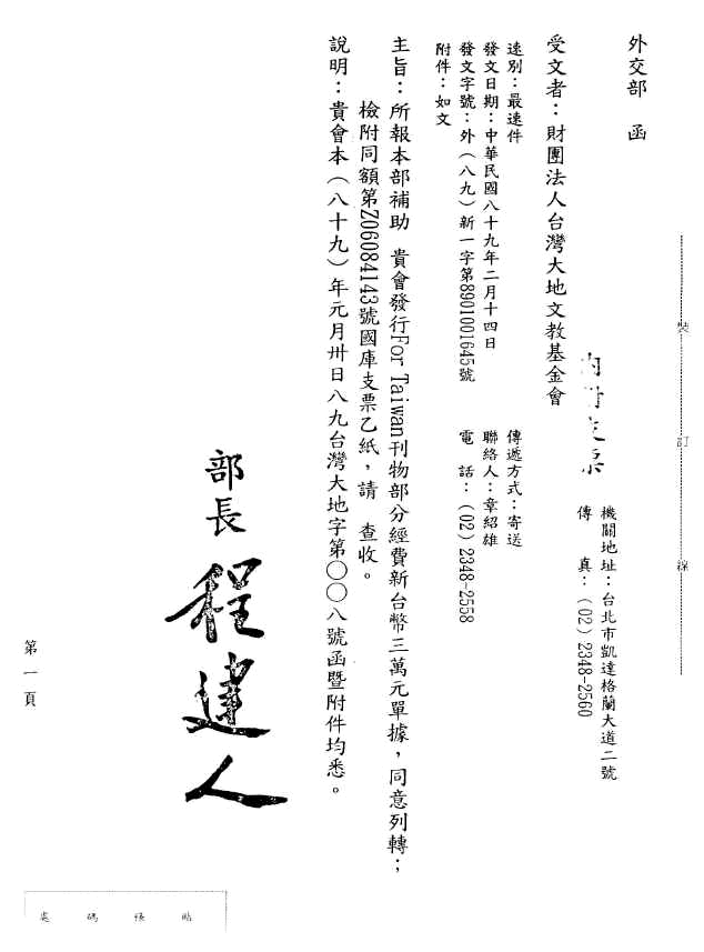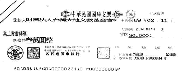 Feb. 14, 2000 --- 外交部回函