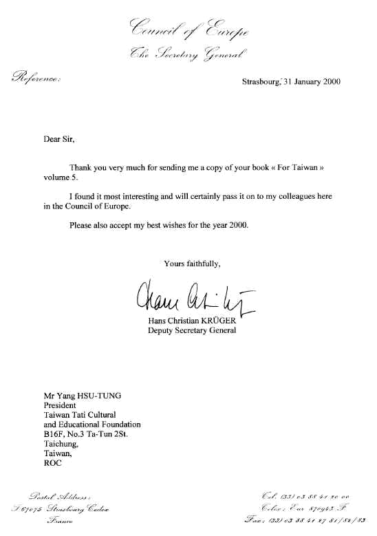 Letters from Hans Christian Kruger, the vice Secretary-General, Council of Europe