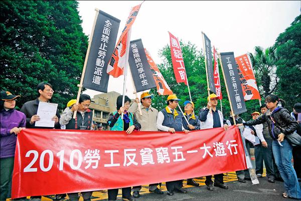 〔記者謝文華、王昶閔/台北報導〕全國產業總工會串聯公、民營工會組成的「勞工反貧窮行動聯盟」,昨天在行政院門口召開記者會,向總統馬英九、行政院長吳敦義提出四大訴求:禁止勞動派遣、反對消滅工會、勞工權益納入ECFA談判、政府撥補勞保虧損,讓受僱者均享年金權利。聯盟並強調,若政府不提出改善方案,五月一日將上街頭進行更激烈抗爭,年底五都選舉,更將以選票唾棄馬政權。