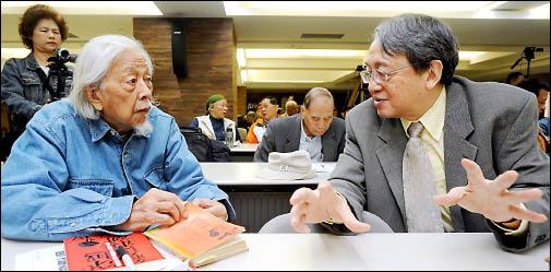 台灣教授協會昨天邀請史明(左)與林保華(右),就「台灣民族主義與馬克斯主義」進行對談。 (記者林正攝)