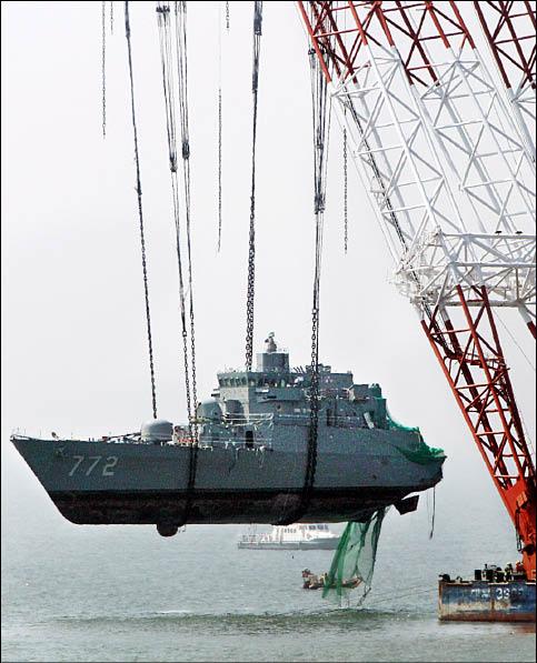 一部巨大起重機二十四日吊起天安艦艦首部分。