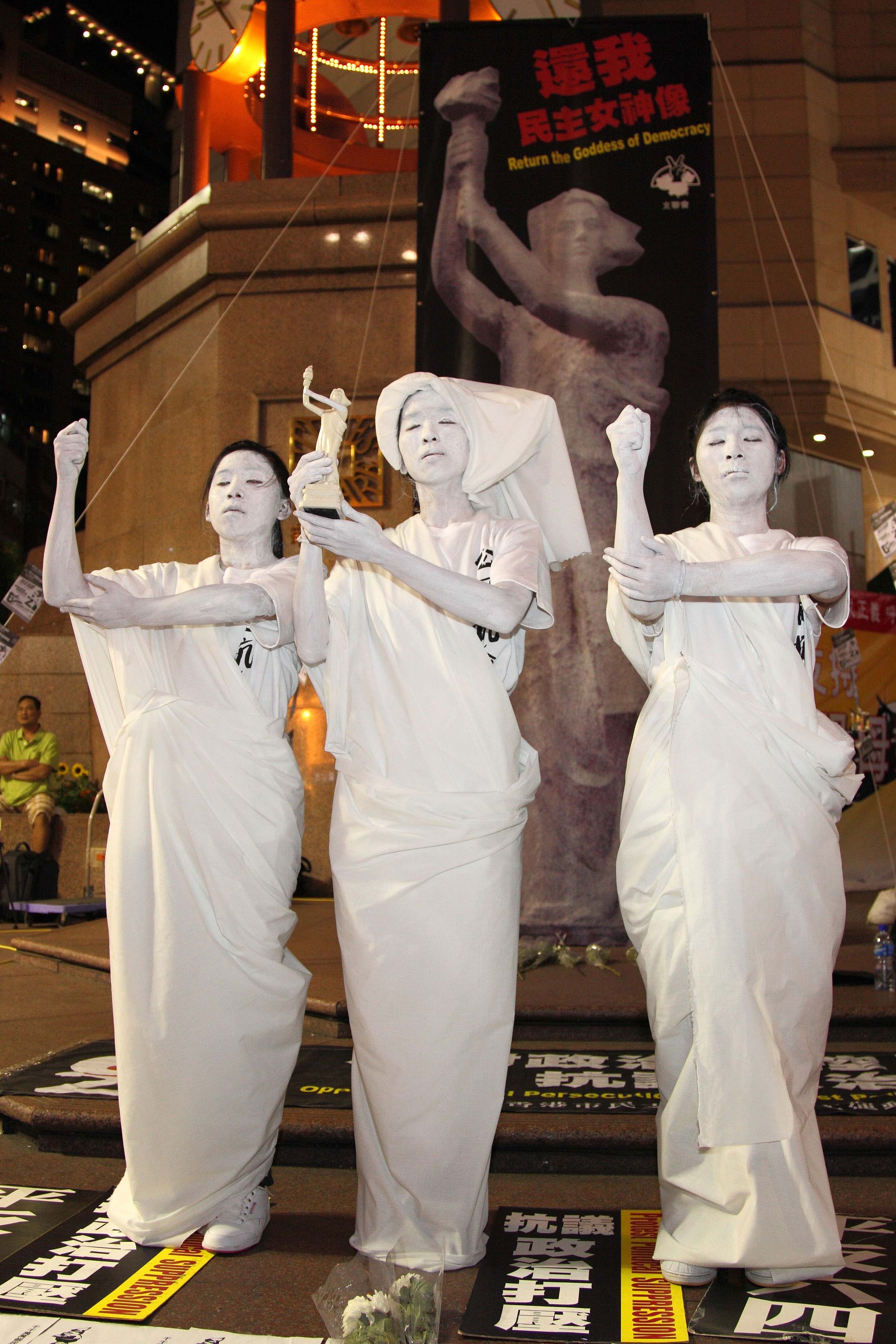 一批年輕人前晚在時代廣場豎起一幅15呎高的民主女神噴畫,其中3人更打扮成民主女神模樣在現場站立,表示公民抗命。(大紀元)