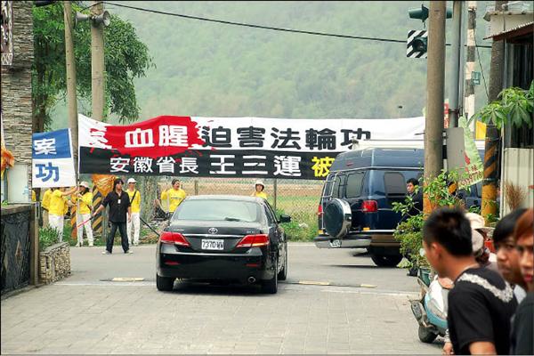 昨天一大早,通往瑪家鄉佳義國小的沿山公路出現上百名法輪功成員,抗議安徽省長王三運迫害法輪功成員,武力鎮壓造成嚴重死傷,屏東警方為防止衝突,派出數十名警力到場戒護,許多身穿高金素梅團隊背心及配帶特殊識別證的人員,早已在校園各出入口層層把關,防止民眾進入,王三運在大批訓練有素的安全人員保護下,享受形同元首級的規格,驅車直達會場。