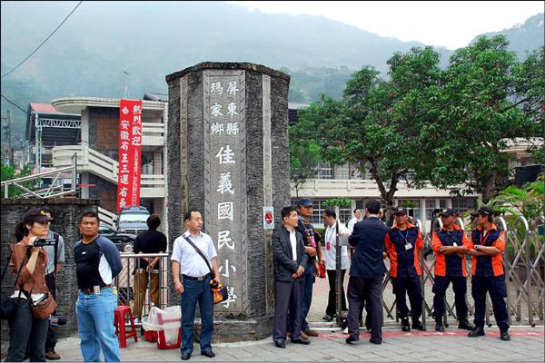 立委高金素梅昨天邀請安徽省長王三運參訪屏東縣佳義國小,來路不明的安全人員及制服守衛在校門口把關過濾進出人員,強勢阻擋未在核准之列的媒體進入。(記者李立法攝)