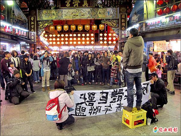 反媒體巨獸青年聯盟一車走天涯串連行動,第一站抵達基隆廟口夜市開講。 (記者俞肇福攝)