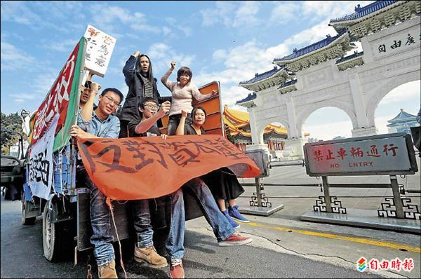 反媒體巨獸青年聯盟昨天從自由廣場出發,展開一車走天涯串連行動,向全民宣講反媒體壟斷重要性。 (記者林正堃攝)