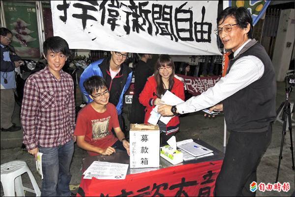 反媒體巨獸青年聯盟一車走天涯串連行動,吸引不少熱心民眾捐款贊助,一捐就是千元大鈔。 (記者羅正明攝)