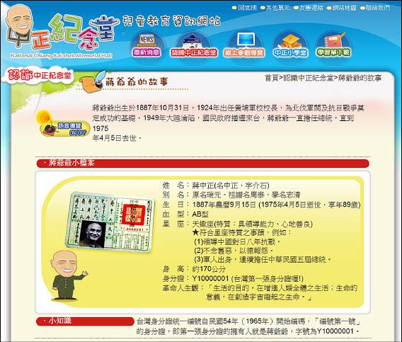 〔記者林曉雲、趙靜瑜、曾韋禎、蘇永耀/台北報導〕「總統蔣公,您是人類的救星,您是世界的偉人…」有家長陪就讀國小的女兒做功課時,上中正紀念堂兒童教育資訊網站,發現官網介紹「蔣爺爺的故事」時,極盡「拍馬屁」之能事,不但指蔣介石「心地善良、不念舊惡、以德報怨」,最末還附有「蔣公紀念歌」,內容稱頌「總統蔣公,您是人類的救星,您是世界的偉人…您是自由的燈塔,您是民族的長城。」