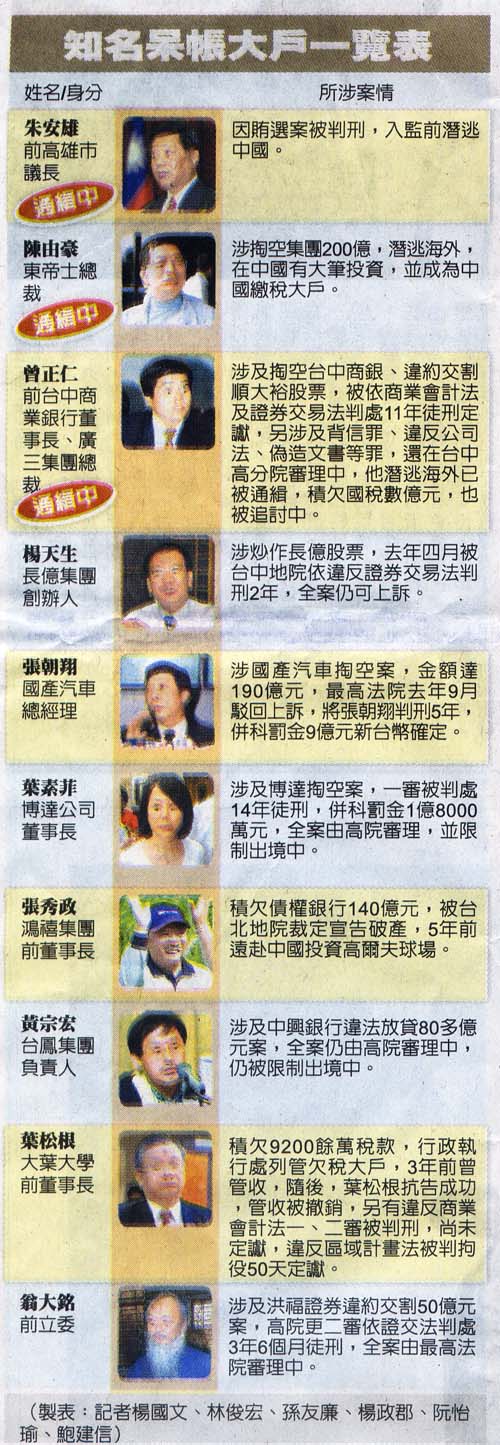 2007.03.16自由時報 吃夠夠 呆帳大戶依然風騷 說穿了,公布呆帳大戶名單不過是個讓大家在苦悶的日子中,多一個發洩情緒的管道,能起什麼作用?罵完了,欠債的仍然逍遙法外,過他的好日子,吃香喝辣。該上班賺錢養小孩、繳貸款的老百姓們,還是得出門去工作。當官的則滿足社會期待,官位得以確保。 建立預警制 刻不容緩 政府玩這種把戲以為可以「喚醒」那些欠錢的人的「道德良知」,還不如將腦子多用於建立有效率的預警系統,降低人謀不臧,少點官商勾結。 攤開各大行庫的呆帳大戶名單,「黑名單」非常類似,有一時賺到錢、大肆擴張者;有想當上市公司老闆、借殼上市炒股票的;有因為兒子當省議員,手上企業又處於風光期,借錢容易的;也有作假帳被抓包的。 呆帳戶行業 包山包海 倒帳大戶所從事的行業則囊括「食、衣、住、行、育、樂」,如許多五年級生相當熟悉的小美食品,養殖業的公鹿實業;紡織業的瑞圓纖維。住的就多了,長億開發、擎碧建設、虹邦建設等。行的部分,公車就是大家最熟悉了,台北市的大有巴士。提供民眾休閒娛樂的呆帳戶也不少,紅極一時的亞哥育樂、做網球拍的光男企業、漢神百貨等,連做涼椅、女性內衣也難免因財務困難,只好倒債。 別以為只有企業才會欠大錢,許多知名人物積欠的金額非常嚇人,是一般民眾工作一輩子都賺不到的,陳由豪、張朝翔、周人蔘,都是欠下上億元的大老闆,至今沒有清償。曾經是橫跨政商界的知名人物如張秀政、楊天生、朱安雄、曾振農,其所主導的集團所積欠的鉅額債務,更是令人咋舌。不過,一般民眾欠了錢,一定拚了老命賺錢來還,大老闆們並不如此想!朱安雄家族所屬的安鋒集團用安鋒鋼鐵、峰安金屬、振安鋼鐵等不同的名義向銀行借錢,光是台銀等八大行庫的呆帳金額就逼近百億元,朱安雄早已逃離台灣,成了通緝犯。欠下鉅額債務的陳由豪也逍遙海外,日子愜意,甚至成為中國的繳稅大戶。 政府拿滯留海外不歸的通緝犯沒法子;就是留在國內的許多欠債大戶,政府也一樣使不上力。 債權銀行說,許多大老闆們早就脫產了,就算擔任企業貸款的連帶保證人,查封不到個人財產,也是白搭,總不能像民間討債公司一樣,找人海扁。沒擔任連帶保證人,那就連催討債務的理由都不成立,只能眼睜睜的看著欠債企業的老闆開名車,吃好、住好。 聽了債權銀行的解釋,看完了銀行承辦、簽證會計師沒日沒夜趕工出爐的呆帳大戶,倒帳的人,日子依舊快活,接下來該怎麼辦?媒體在等待明年公布時,有沒有新鮮的名單;銀行在擔憂別發生呆帳;官員則繼續指揮銀行要及時公布名單,對金融秩序到底發揮了什麼效果? 民代沒份? 人頭戶作祟 〔記者鄭琪芳、李靚慧、梁世煌/台北報導〕各銀行陸續公布億元以上呆帳大戶,但多是以往曾爆發財務危機的企業,卻不見欠帳不還的民意代表,對此,財金高層表示,民代向公股銀行借款,都是利用人頭戶,民代本身則是當保證人,因此,銀行公布的呆帳大戶,很難看得到民代的名字。 金管會主委胡勝正昨日則指出,過去公司治理偏重企業的單獨治理,未來將企業資訊連接後,將朝向集團企業的治理。 對於銀行公布的呆帳大戶不少人已經不在國內,胡勝正說,公布呆帳大戶的目的,是希望藉由「社會壓力」,督促這些欠款大戶還錢,對於那些早已潛逃出國的呆帳大戶,將持續以現有的法律機制,向這些呆帳大戶進行追討。 財金高層指出,這次各銀行公布呆帳大戶,其中又以彰化銀行、第一銀行及台灣中小企業銀行等公股銀行的呆帳總額最驚人,除了是因為公股銀行市占率高,呆帳因此比較多之外,政黨輪替前不少民意代表欠帳不還,也是公股銀行呆帳居高不下的主因。 財金高層私下表示,凍省以前,前省屬七大行庫幾乎可以說是省議員的提款機,很多省議員在行庫都有貸款,甚至還曾發生某位女性省議員因借不到錢,而掌摑合作金庫高層的事件,一度鬧得沸沸揚揚。 此外,財金高層也表示,公股銀行呆帳金額大,也顯示管理嚴謹度有待改進,未來將會加強管理,希望找尋專業的經營團隊進入公股銀行。 |