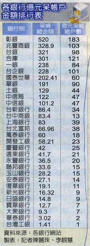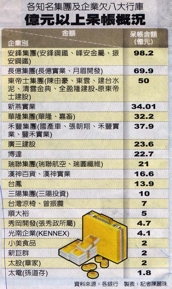 2007.03.16自由時報 揹呆帳 彰銀520億最慘 〔記者梁世煌、陳麗珠、楊雅民/台北報導〕根據金管會統計,銀行所公布的第一期億元以上呆帳名單,總戶數一千五百戶,金額為三千七百億元,光是安鋒、長億、東帝士三個集團的呆帳就超過總金額的十分之一。 四十多家銀行公告 有漏網之魚 儘管四十多家銀行已完成呆帳名單的公告,但是金管會官員透露,有部分銀行居於客戶要求,將一些呆帳戶的名字從呆帳資料中暫時移除,由於銀行的呆帳資料必須經過會計師查核後才能公布,一旦資料有遭竄改或造假的疑義,或是銀行業者刻意隱匿特定呆帳的資料,金管會除了要嚴懲外,相關法律責任也都將由銀行及簽證會計師負責。 據了解,一億元以上的呆帳資料在昨天公布之前,部分不願曝光的呆帳大戶就開始跟銀行進行協商,希望透過還款協議好讓自己的名字在呆帳資料中除名。 特權關說 原省屬行庫失血最多 一位銀行業主管表示,雖然昨天公布的呆帳資料均為轉銷呆帳,其還款機率已相當低,但在呆帳資料公布的壓力下,仍不排除會有債務人出面還款的可能性。 這一波公布的呆帳大戶名單中,台銀、土銀、三商銀、台企銀等原省政府所屬七大行庫「災情」最慘重,由於老行庫的人情貸款、民代特權關說貸款、配合政策性紓困貸款等「滿懷苦衷」的融資案相當多,加上八十七年間爆發本土性金融風暴,及台商在台借錢投資中國,留下爛帳,才會造成老行庫被大戶倒帳的金額特高,彰銀被大戶倒了五二○億元,成了最大的「苦主」,台銀、合庫也達三百億元以上。 在幾家老行庫中,台銀未將不良債權賣給資產管理公司(AMC),全部自己追討,其他行庫為了降低逾放比,陸續大筆出售不良資產給AMC,出售的量高達七、八百億元。目前公布的呆帳大戶已不包括賣給AMC的債權,否則呆帳大戶戶數、金額將遠遠超過所公布的資料。 根據統計,目前公布的省屬七大行庫再加上屬中央政府的中信局,呆帳大戶金額逾二千億元,其實只是冰山一角,已經賣給AMC的部分,加上力霸集團的債權,實際的呆帳大戶金額更為龐大。 至於成立時間較短的新銀行,呆帳金額明顯比老行庫低,其中台新銀行以八十六點四二億元居新銀行第一位,而包括張朝翔及其成立的國產汽車、前立委朱安雄的安鋒集團、楊天生的長億實業等,是多家新銀行的主要呆帳大戶,其貸款之後所留下的財務大洞,同樣讓這些新銀行的主管相當頭痛。 至於在台有分行的卅一家外銀,共有十六家有億元以上的呆帳大戶,合計呆帳轉銷總金額九十六點四億元。其中,以花旗銀行居冠,達二十五點四億元。 安鋒164億 長億142億 東帝士113億 〔財經中心記者/綜合報導〕國內銀行昨日公布一億元以上呆帳名單,朱安雄所負責的安鋒集團呆帳金額超過一百六十四億元排名第一、楊天生所負責的長億集團呆帳超過一百四十二億元、陳由豪所負責的前東帝士集團呆帳超過一百一十三億元排名第二、三名。 昨日是金管會規定各銀行公布九十五年六月底之前,一億元以上呆帳大戶名單的截止日期,除了二十幾家銀行已於前日搶先公布外,其他的銀行在昨日均完成公告。除了在各銀行自己的網站公布本身呆帳名單外,金管會的網站也登錄刊上各銀行申報的資料,民眾如果欲了解詳細的情形,可以到金管會的網站查詢。 從各銀行公布呆帳資料分析,泛官股銀行的呆帳情形確實比民營銀行嚴重,尤其是過去的省屬行庫的呆帳更是排前。 在呆帳大戶中,在泛官股八大行庫中名列第一(九十八億元)的安鋒集團,在加入民營銀行的呆帳後,總金額超過一百六十四億元仍高居冠軍,長億集團在銀行業的一億元以上呆帳佔有一百四十二億元以上緊接其後。 前東帝士集團的呆帳也超過一百一十三億元,排名第三;第四名則是張朝翔負責的禾豐集團,呆帳金額超過八十億元,禾豐集團在八大行庫的呆帳就高達三十八億元;華隆集團在八大行庫的呆帳有三十二億餘元,加計民營銀行的呆帳之後,總呆帳額近五十九億元。 另外,當初發生財務危機而且下市的新燕實業在泛官股行庫的呆帳有三十四億元以上,也是大戶之一。 而包括曾正仁的廣三集團三十一億元、葉素菲的博達公司的四十一億元、大穎企業四十一億元;瑞聯集團、黃宗宏的台鳳在銀行的呆帳均介於二十至三十億元之間。另外,黃世惠的三陽集團、張秀政的秀岡開發等,在銀行的呆帳超過十億元。 |