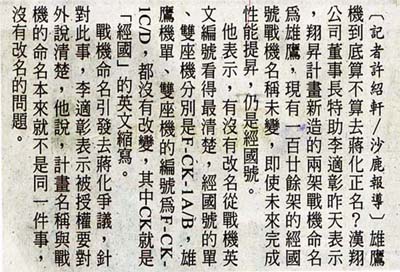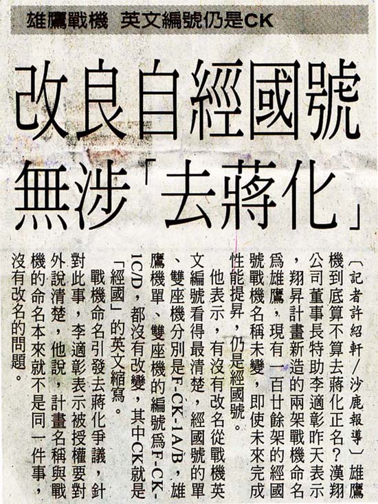 漢翔展現成果 軍方應正視 記者許紹軒/特稿 在內外多重壓力夾雜下,雄鷹戰機能風光地對國人公開,漢翔公司上下齊心突破重圍,實屬不易。而在陳總統背書下,空軍如何「正視」翔昇案成果,也成為重要的課題。昨天的翔昇專案命名典禮,中科院與漢翔兩個主要計劃執行單位一開始就不同調。從去年十月四日單座機首飛開始,漢翔屢次想要公開戰機都被軍方否決,甚至昨天的命名點禮,國防部長李傑一直到前晚七、八點才決定出席,才使包括空軍司令沈國禎在內的空軍官員出現會場。 不過為了避免給人背書的感覺,試飛過程幾個飛行動作引來漢翔員工熱烈鼓掌時,空軍將領不是不動如山,就是交頭接耳,極少有隨之鼓掌的場面,讓人不得不懷疑,空軍出席活動並非本意。 但IDF戰機需要性能提昇的事實卻也擺在眼前,沒有新式油箱多出來的一千二百磅燃油,戰機滯空時間依舊短得可憐;IDF當成載台,中科院研發的「青雲」油氣彈、「天劍二A」反輻射飛彈、「萬劍」機場遙攻武器等對地攻勢武器才有機會發揮戰力。 也因此,昨天典禮結束時,空軍司令沈國禎被媒體問到:「司令,這件事情(指雄鷹機)有什麼打算?」他倒是回答的相當巧妙,我現在正在打算。一句話道破空軍所面臨的處境。 面對總統的加持,空軍看來得放棄先前對翔昇機的不屑,認真思考一下要怎麼做才能雙贏了。 改良自經國號 無涉「去蔣化」