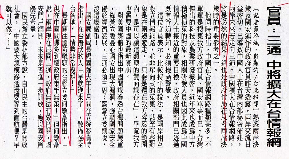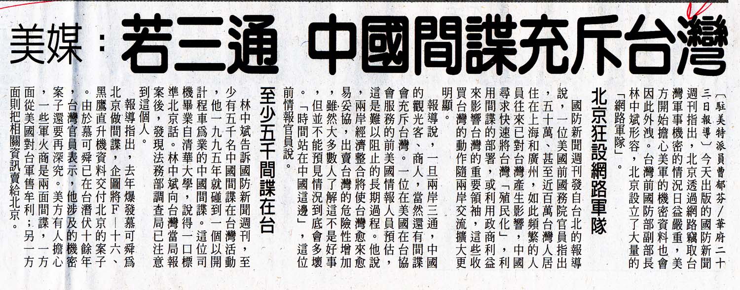 2007.04.25自由時報 美媒:若三通 中國間諜充斥台灣