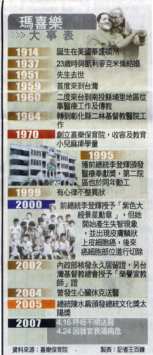 〔記者王百鍊/彰縣報導〕瑪喜樂四十五歲來到台灣後,見到許多小兒麻痺患者乏人照顧,甚至遭遺棄,決定要留下來幫助這些人,進而在彰化縣二林鎮創立喜樂保育院,將下半輩子完全奉獻給我國身心障礙者,如今她正與死神搏鬥,但宛如美國來的「媽祖婆」形象,長存在許多民眾心中。 來台48年 奉獻台灣醫療照護 喜樂保育院指出,一九五九年瑪喜樂來到台灣加入醫療行列並傳教,發現有太多的民眾需要照顧,隔年返回美國籌款,當年隨即帶著變賣的家產所得以及教會募集而來的衣物、藥品等再度回到台灣。 阿嬤先到南投縣埔里鎮基督教山地中心診所、埔里基督教醫院幫忙,一九六四年轉到彰化縣沿海的二林區服務,當時小兒麻痺在國內仍流行,許多二林地區的小孩得病後,因無錢看病治療,只能在地上爬行。 一九六四年十一月,二林基督教醫院成立的第一天,就出現二百二十二名患有小兒麻痺的小孩子前來登記求診,看到許多人爬著進來,瑪喜樂大感不捨,決定後半生要全心全力照顧這些折翼天使。 院方指出,一九六五年醫院設立附設的小兒麻痺保育院,收留了十六名兒童,阿嬤親自負責照料,為了照顧更多病童,阿嬤後來又在醫院附近創立喜樂保育院,當時收留人數達八十一人。 創立喜樂 收留小兒麻痺病童 「匍匐在地上,總在別人腳下像狗一樣地衝來衝去,突然可以站起來走路,驕傲地抬頭挺胸,孩子不斷說好高興,讓我也很高興。」這是阿嬤一九六六年寫給美國柏克萊第一長老教會的宣教報告部份內容,可以看出阿嬤助人的快樂與感動。 院方說,後來小兒麻痺症逐漸在我國絕跡,阿嬤又將愛心擴大到其他身心障礙者,除了原院區擴大之外,又興建第二院區,如今第三院區也已在規劃中。 院方表示,阿嬤最近幾年數度進出醫院加護病房,去年一度病危,儘管阿嬤近幾年來已無法親自處理院務,但大家仍視她為精神領袖,希望能將阿嬤的愛繼續發揚光大。 總統讚阿嬤 正港台灣人