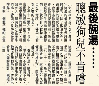 台中市動保團體以牛肉湯摻鎮靜劑為流浪動物執行安樂死,但有些聰明的狗兒就是不肯喝。 |