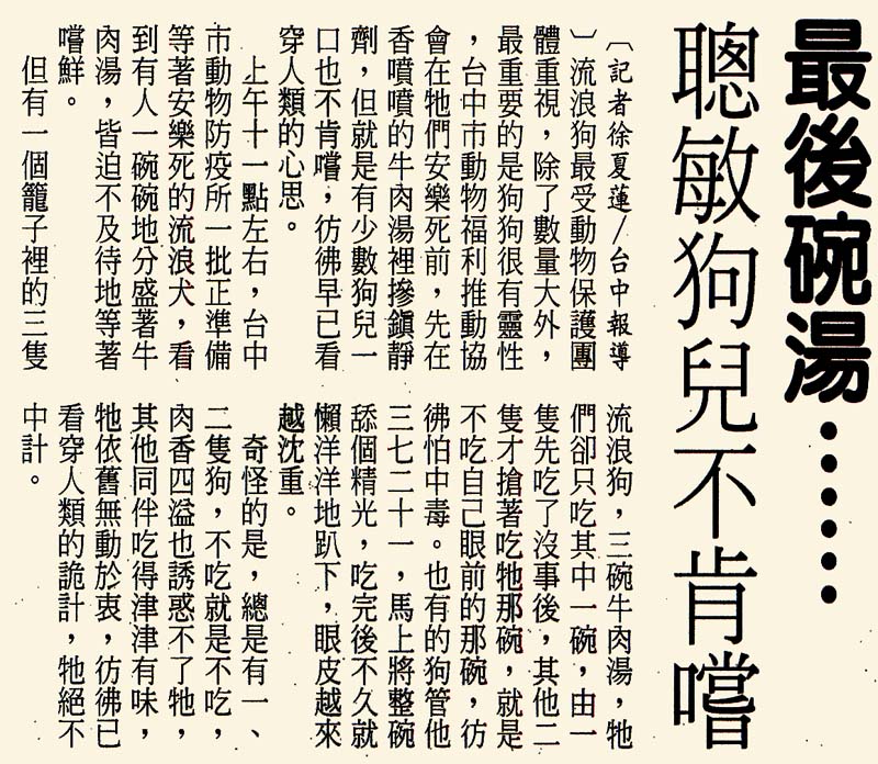 2007.05.17自由時報 牛肉湯+鎮靜劑 流浪動物睡眠中安樂死 〔記者徐夏蓮/台中報導〕動物防疫所執行流浪動物安樂死,常被動保團體抨擊「黑箱作業」,台中市動物防疫所今年三月起將流浪動物安樂死的任務,委由動保團體執行,他們讓流浪犬貓等動物死前吃摻有鎮靜劑的牛肉湯,睡著後才由獸醫師執行安樂死,死前果然不再恐懼掙扎淒厲哀號。 動保團體執行 台中市動物防疫所依據動物保護法規定,收容的流浪犬隻七天以上無人認領、認養,亦無適當處置場所,即可予以安樂死,雖有不少人反對讓流浪犬安樂死,但不安樂死,誰願養牠們? 以往流浪犬安樂死,是直接注射麻醉劑,防疫所工作人員人手有限,流浪犬隻看到同伴打針後倒下,聰明的牠們馬上就知道怎麼回事,掙扎淒厲的哀號此起彼落,讓工作人員情緒也跟著盪谷底,還要面對動保團體猛烈抨擊。 動物防疫所今年乾脆將「安樂死」工作,上網公開招標委由動保團體執行,讓安樂死過程透明化,最後由中市動物福利推動協會得標,他們在有限經費下,今年三月二十八日開始執行安樂死任務。 台中市動物福利推動協會常務理事長張文玲,就是執行動物防疫所委外流浪狗安樂死的靈魂人物,她是位牙醫師,要不是因為有三年當全職媽媽,讓她有時間帶著孩子去公園,她根本不會發現流浪狗的問題竟有那麼嚴重。 現年三十七歲的張文玲說,看到一隻隻被丟棄的狗兒,數量多到超乎想像。因此成立台中市動物福利推動協會,努力推動動物結紮、宣導保護動物。 張文玲說,她並不主張對流浪動物安樂死,但為了提升流浪動物收容所的收容品質,她很敬佩中市動物防疫所所長余建中,讓「安樂死」過程攤在陽光下,她希望有一天全台都能仿效。 她說,三月底迄今,安樂死的流浪動物中,除犬隻外,也有被丟棄的貓、兔子、迷你豬,這些動物先吃摻了鎮靜劑的牛肉湯,要讓牠們肌肉鬆弛後,再打麻醉劑,讓牠們不會因緊張而肌肉繃緊,增加血管注射的困難度,貓比狗更緊張,更需要先打或吃鎮靜劑,幫助牠們在平靜中接受安樂死。