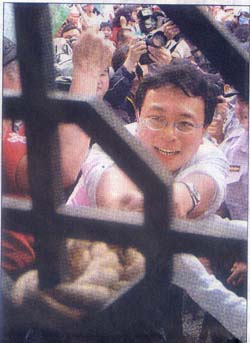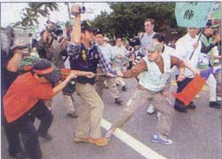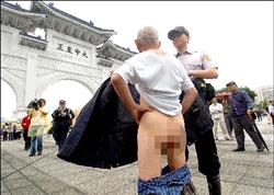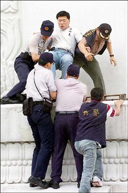 支持與反對更名者 互嗆起衝突 〔記者蘇永耀、施曉光、王述宏、申慧媛/台北報導〕中正紀念堂昨天正名為「台灣民主紀念館」,支持與反對更名的兩派民眾到場相互嗆聲,罵對方「滾蛋」、「不要臉」,還拿雨傘當「武器」互K,零星小衝突不斷,一名八十二歲的老翁甚至當眾脫褲子遛鳥。 到了昨天下午,現場更加混亂,不但有「九○八台灣國運動」等團體前往「拆除」封建圍牆,剛架好的「台灣民主紀念館」立牌也被反對更名者破壞,國民黨北縣議員陳明義爬上「大中至正」牌樓底座,並在抵抗警方勸離時涉嫌妨害公務。 北縣議員陳明義等五人 被逮捕 最後,警方逮捕陳明義等五人。但因目前為議會開議期間,陳有不得逮捕的保護傘,故警方將於會期結束,再行傳喚陳說明。當眾脫褲「遛鳥」的老翁,則被以妨害風化罪嫌移送;另一名六十八歲的許姓男子持美工刀四處比劃,依違反社維法裁罰後釋回。 混亂過程中,中正一分局督察組長謝德義遭水瓶砸中臉部,一名「台灣國」的翁姓男子被捕,但因蒐證影帶無法辨認水瓶係由翁所丟,警方遂先將他釋回。另外,「九○八台灣國運動」總召集人王獻極則違反集會遊行法,警方將擇日傳喚。 為了昨天的揭牌儀式,警政署與台北市警局動員了大批警力維護秩序,並以人牆區隔藍、綠兩方民眾。但在「大中至正」門外,支持和反對更名民眾一早開始就零星衝突不斷。 九○八作勢拆圍牆 涉違集遊法 下午一點,「九○八台灣國運動」舉行「拉倒封建圍牆、開放民主廣場」活動,群眾則用粗麻繩綁在廣場左側的圍牆窗櫺上,以拔河姿態作勢要拉倒封建圍牆。北市中正一分局警方立即出面制止,同時舉牌警告集會活動未經過申請核准。 「九○八台灣國運動」決定轉移陣地,改以繞行紀念館遊行方式,不過,當隊伍經過藍營群眾前,雙方展開叫陣,還有空保特瓶亂飛,場面再度混亂,警方忙以優勢警力出面排除追逐的人群,鎮暴警察也出面制止。 九○八成員遊行離開後解散,因王獻極未經申請即進行集會遊行,經警方舉牌四次,認定已違反集遊法。 反對更名民眾則在下午館區重新開放後,找新架好的「台灣民主紀念館」立牌出氣,有人伸腳踹,有人作勢要扯、拔立牌,還有一面被寫上了一個「假」字。 對有民眾當眾毀損告示牌及路線指示圖等標示,紀念館館長曾坤地表示,初步了解,其中一名當事人是有躁鬱症傾向的精神病患者,所以仍在研議是否提告,但其他人若是惡意、蓄意地破壞館方任何標示及花草物品,館方一定會提毀損告訴。 |