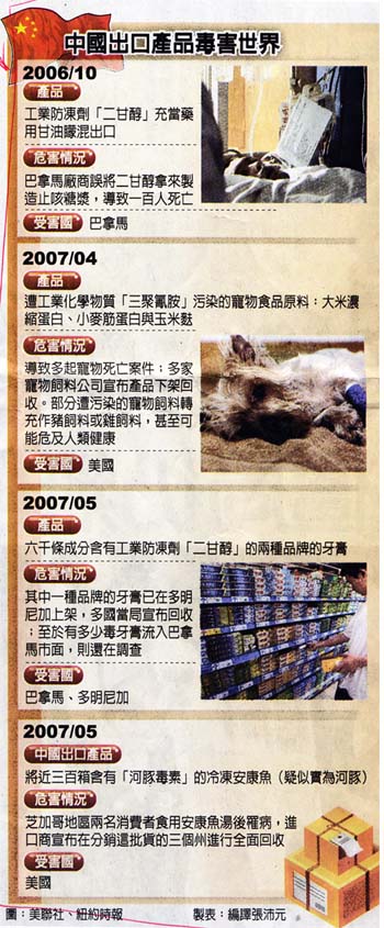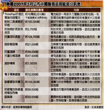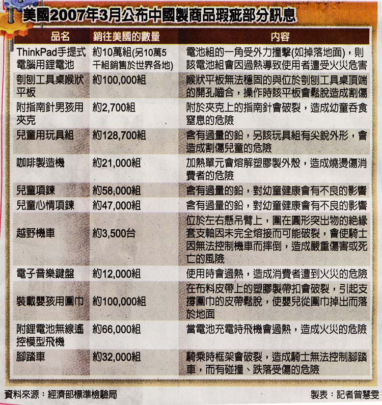 2007.05.26自由時報 美公布瑕疵商品 43%中國製 〔記者曾慧雯、田瑞華/綜合報導〕中國黑心產品無所不在!經濟部標準檢驗局蒐集、彙整美國消費者產品安全委員會(CPSC)網站瑕疵商品相關訊息,發現其中有四十三%瑕疵商品都是中國製,且可能造成消費者燒傷、觸電、窒息等傷害。 標檢局彙整美國CPSC自二○○六年六月至二○○七年二月間公布的瑕疵商品訊息,結果發現二百五十六則瑕疵商品訊息中,中國製造的瑕疵商品就有一百一十則,約佔四十三%。 標檢局表示,單是今年二月份美國CPSC公布的中國製瑕疵商品,就包括捲髮器、桌燈、遙控器、嬰兒靴等十餘種,且有造成消費者燒傷、觸電、窒息等傷害案例。 三月份最新公布的中國瑕疵產品又增加約廿項,連兒童項鍊、電子音樂鍵盤、裝載嬰孩用圍巾、越野機車都出問題。 標檢局網站公布訊息 因兩岸旅遊、商貿往來日益密切,標檢局已將中國製商品瑕疵訊息登錄在標檢局網站上(www.bsmi.gov.tw ),提醒消費者注意。 至於台灣部分,有鑑於中國黑心產品流入市面,例如含致癌物硝基?喃代謝物的大閘蟹、含致癌物質聯苯胺的毒毛巾、工業用鹽充當食用鹽、含重金屬汞、鉛或鎘超量的中藥等,損害消費者權益,標檢局表示,只要是屬於應施檢驗品目,就會在海關進口時抽查,此外標檢局也會派員在市面上不定時抽檢。 局長陳介山表示,對於手機零件、中國毛巾與大閘蟹等進口商品,標檢局都會進行抽驗,水產品若驗出不合格,會將貨物扣留、逐批查驗,直到連續五批水產都通過檢測才能放行。 陳介山指出,抽驗分成三種,第一種是逐批檢驗,多用在風險較高的貨品上,例如東南亞進口的花生等;第二種則是抽批檢驗,大約二十批會抽一批檢驗;最後則是針對動物用藥殘留部分則採取監測方式,大致確定貨品未出現變質腐敗情形後,會在抽出檢驗樣品後先整批放行通關,之後再化驗樣品。 陳介山說,檢舉黑心商品並無獎勵金,但為替全民的健康安全把關,歡迎民眾踴躍檢舉。 有關中藥材部分,目前多由我進口商要求產地業者檢附相關有害物質的檢驗報告,進口後由衛生署抽檢。