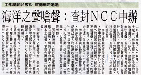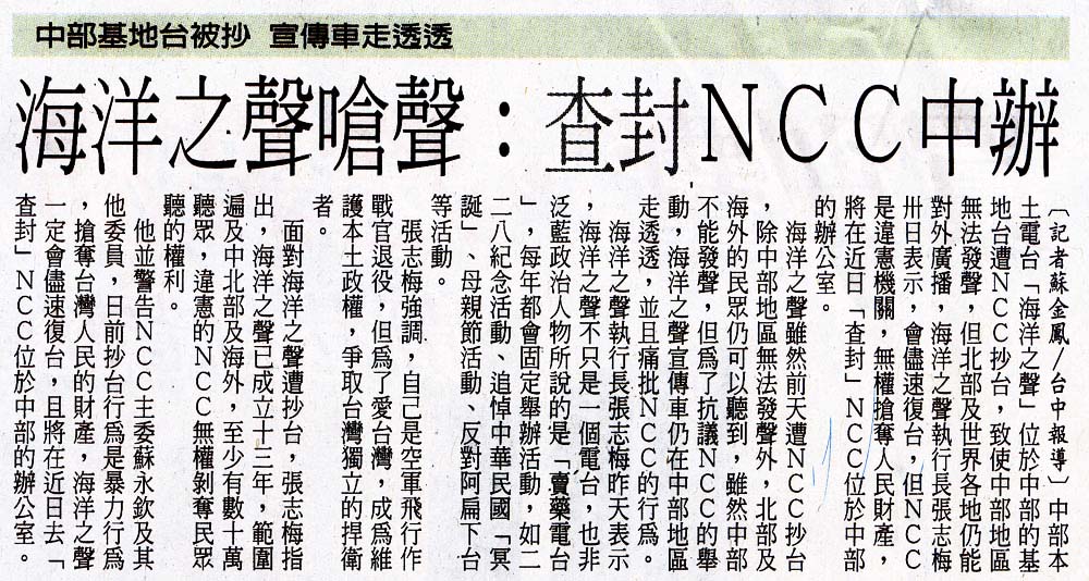 2007.05.31自由時報 海洋之聲嗆聲:查封NCC中辦 |