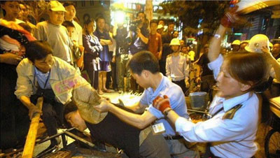【記者辛菲/採訪報導】6月13日,陝西西安灞橋區紡織城紡九路上上千民眾與城管發生暴力衝突,2輛城管的車被砸毀。據當地民眾透露,事發後,當地媒體歪曲事實。另據《三秦都市報》一名記者披露,當晚事件後,當地各家媒體就收到「上面」的交待,按照「通稿」發表。 城管施暴 民眾義憤砸車 據現場目擊者向《大紀元》透露,當晚5時多,「誠信裝飾中心」經營者陳康(音)及其父母將部分貨物擺到店門口,很快有十幾名城管開著兩輛車到來,他們一下車就開始搶門口的物品。陳康及其父母出面阻撓,均遭到群毆,3人當場輕度昏迷。 城管打人時還說:「打人打傷了有黨付錢你們不用管,給我往死了打……」「我就是土匪」……當時正值下班高峰,周圍立即聚集起上百人,將城管團團圍住,有人開始撥打110報警。20多分鐘後,周圍聚集起上千民眾。 110警察到現場後,未做任何筆錄,直接就要把城管帶走。民眾堵住警車要求現場處理。有人說:「我們都是目擊證人。」僵持幾分鐘後,警察趁亂帶城管一起溜走,留下兩輛城管車。 部分民眾從城管的車輛裡搜出4把砍刀和十幾根木棍,頓時群情激憤。直到晚上將近10時無人出來維持秩序。民眾們拿起城管車上的棍子,將2輛城管車砸毀,其中一輛被推翻。 城管猶如黑社會組織 目擊者董先生說:「城管就像黑社會組織,橫徵暴斂,不時搶就是砸,隨便打人甚至打死人都沒事,政府還包庇他們。但老百姓一起來反抗,就被稱為『暴力抗法』,這是什麼道理!」 據楊先生透露,當地城管多是當地領導的親屬子女、或者是跟他們有關係的人的親屬子女。 媒體發「通稿」 報導失實 據目擊者肖先生向《大紀元》透露,當晚數家媒體到現場採訪,民眾紛紛向記者們投訴。但在當地幾家媒體的報導中稱,「經營戶公開阻撓執法,用麻鋼、角鐵等兇器毆打執法人員,公開抗法」,並稱,「四五名社會閒人藉機煽動滋事」。 另據《三秦都市報》一名記者向《大紀元》披露,當晚事件後,當地媒體就收到「上面」的交待,按照「通稿」發表。他說:「這種事,要麼不讓報,要報也得是上面的指示。」◇ |