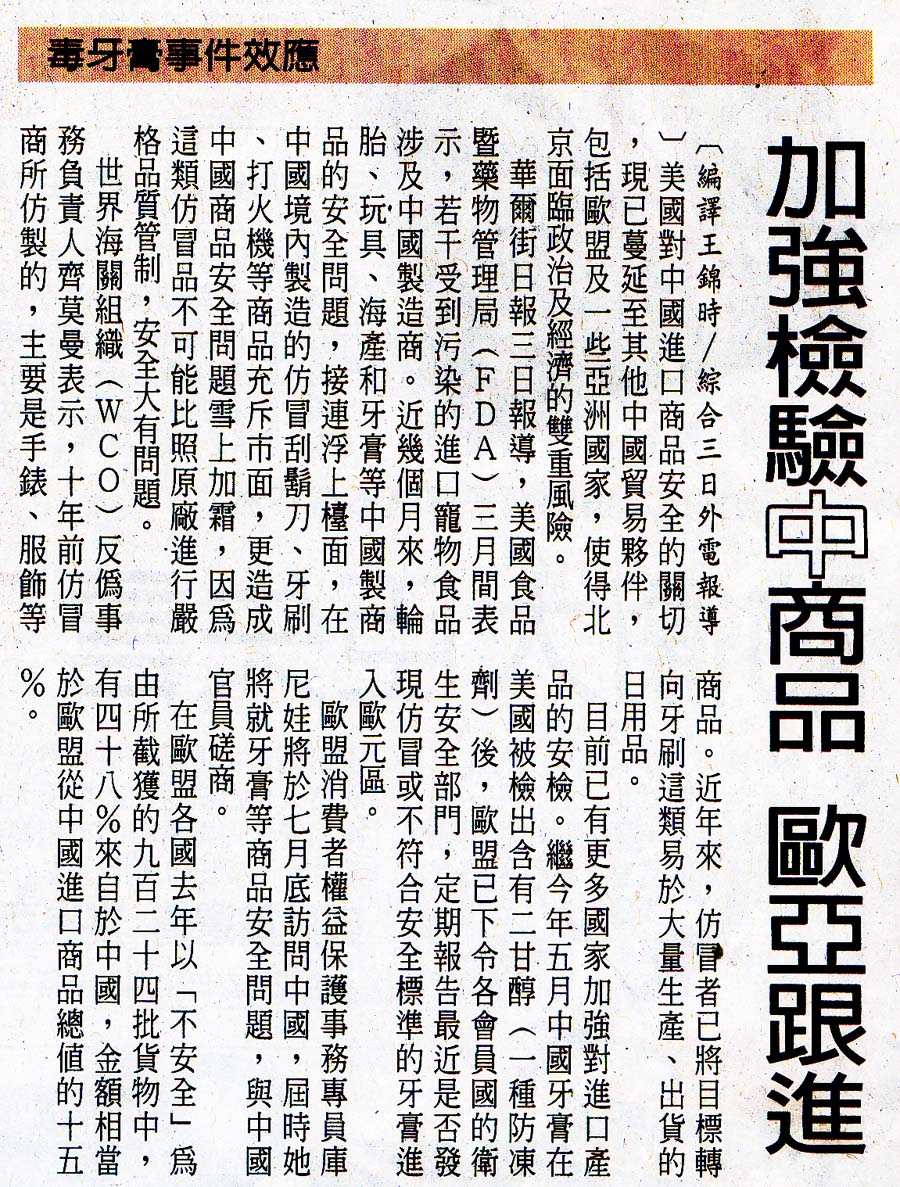 【記者郭秋怡/綜合編譯】近幾個月以來,中國輸美多項產品爆發出具有危害性,再度使不斷擴增的對中貿易逆差成為美國各界的焦點,更有媒體指出中美貿易大戰可能因而爆發。 據彭博資訊(Bloomberg)等外媒報導,在7月1日的一個新聞發表會上,紐約的民主黨參議員舒默(Charles Schumer)表示,今年以來已有超過一百項的中國產品在紐約及紐澤西的港口被攔截下來,占美國消費者產品安全委員會今年178項回收產品的60%,具危害性的中國產品,從寵物食品、含鉛玩具、海鮮、牙膏、汽車輪胎,到裝了不良電源供應線的120萬組陶瓷電熱器以及6萬8千張易解體的摺疊式座椅等,輸入美國的有害產品,被檢驗出的「只是冰山的一角」。 中美貿易赤字再成焦點 對於中國有毒產品的流入美國社會,路透社近期的分析報導指出,不但已使「中國製」這個商標在美國的形象大受打擊,更刺激了對中貿易應實施保護措施的聲浪再度大作。 去年的美國對中國貿易赤字已達到2,325億美元,且今年以來仍有繼續上升之勢。如今,大規模的產品安全性事件再三爆發,專家分析美國內閣官員將面臨更大壓力,必須採取更為嚴厲的反制措施及保護手段,準此,美方可能再加大施壓,迫使中共在匯率問題上讓步,早已問題多多的中美貿易將因而再度蒙上陰霾。 有害產品引起恐慌 從美國國會議員的公開發言,以及曾有議員致函布希總統對中國瑕疵輪胎進行調查,到主要媒體的大篇幅報導中國進口品的毒害,甚至連近期的一支新廣告都直接點名批評沃爾瑪(Wal-Mart)淪為中國廉價商品在美國銷售的主要通路,美國社會對過度依賴中國廉價產品的意識正在逐漸覺醒。 6月22日亞特蘭大憲章報(Atlanta Journal-Constitution)刊登的一篇社論,在一開頭就直接指出中國簡直就是「在毒化對美貿易」,而且「中國從我們的口袋裡賺走了很多錢,但回報給我們的卻是危害」。 「無任何國家沒有食品及消費品安全的不良紀錄,但證據顯示中國的製造商比其他貿易伙伴更不用心、麻木不仁、或說是不道德」。 除了新聞報導之外,由聯邦政府出資贊助的社團WakeUpWalMart.com,在上週三(6月27日)打出的一支電視廣告中,以諷刺的手法指出到沃爾瑪連鎖店消費就等於在幫助中國打美國,因為「中國運送武器給阿富汗的恐怖份子,是用來打我們軍隊的武器,所以在你到沃爾瑪消費之前,先想一想,7月4日就要到了,當個愛國者吧」。 有毒寵物食品、含鉛玩具火車、化學致癌物過量的牙膏等商品的危害,已開始使中國進口品的需求降低,同時,限制對中貿易的支持率也上升了不少。◇ |