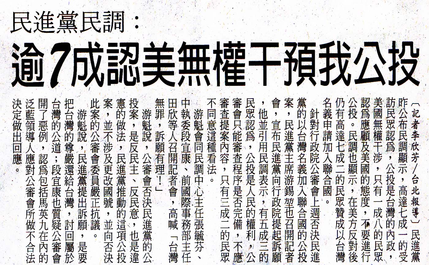2007.07.04自由時報 民進黨: 逾7成認美無權干預我公投
