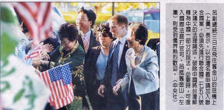 2007.07.04自由時報 呂指扁將研商「台灣」入聯國 訴諸國際法庭 〔記者邱燕玲/綜合報導〕針對我國以台灣名義加入聯合國案,赴中南美洲出訪的副總統呂秀蓮昨在美過境時指出,陳水扁總統有意在她回國後召開國安高層會議研商對策,必要時可進入國際法庭打官司。 她表示,以台灣名義申請加入聯合國案,必須先進行聯合國二七五八號決議文的法理論述,破除中國將台灣解釋為中國一部份的說法。 呂副總統在美國當地時間二日晚間七點半抵達舊金山國際機場。美國在台協會理事主席薄瑞光及駐美代表吳釗燮前往接機,呂副總統並與薄瑞光短暫會談。當地時間三日上午,呂副總統將從舊金山包機率團前往多明尼加訪問三天。 呂副總統在飛機上指出,立法院日前通過希望簽署加入聯合國「消除對婦女一切形式歧視公約」,並行文給聯合國。但聯合國秘書長潘基文回函竟援引聯合國二七五八號決議文,以中華人民共和國是中國在聯合國中唯一合法的代表,及「台灣是中華人民共和國的一部分」為由,認為台灣沒有資格加入。 吳釗燮決化解美對牴觸四不疑慮 呂副總統拿出台美雙方往來電報資料證實所言屬實,她說,一個月前她發現此事立即向總統反映,促請總統重視,並透過吳釗燮向美方提醒。據了解,美國正積極透過正式管道要求聯合國秘書長潘基文收回這項擴大且謬誤的解釋;若潘基文不收回公文,台灣必要時也要進入國際法庭打官司。 吳釗燮指出,以台灣名義加入聯合國案,美方的疑慮是可能牴觸兩千年總統陳水扁就職演說「四不」中「不更改國號」的承諾,但台灣沒有任何計畫更改國號,他會持續與美方溝通,縮小雙方認知的差距。 |