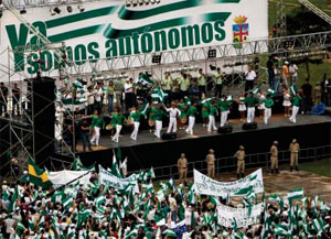 玻利維亞4 個由反對黨控制的省份15 日宣布自治,10 萬民眾慶祝,反對黨承諾把國家財富分給窮人。 總統莫拉瑞斯警告,軍隊肯定不會支持分離分子,反對派設法分裂、政變,絕不容許把玻利維亞分裂。 左翼的玻利維亞總統莫拉瑞斯推行扶貧改革後,反對派指政府的政策會侵害民眾的財富,4 個富有的省分自行宣布自治,莫拉瑞斯警告,軍隊將會鎮壓,以維持國家團結。 玻利維亞有人口950 萬人,宣布自治的四省占人口約35%,他們提出建立類似聯邦制,與中央政府分享稅收。 玻利維亞四個由反對黨控制的省份宣布自治,約10萬民眾慶祝。 |