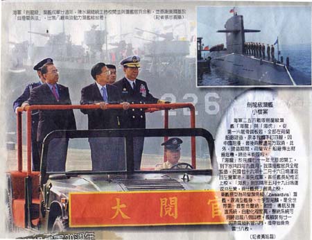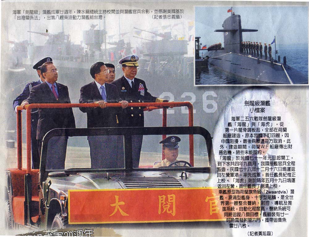 2007.12.19自由時報 扁:加速八潛艦採購作業 〔記者黃旭磊/高雄報導〕海軍昨天上午在左營海軍基地舉辦劍龍級柴電潛艦成軍廿週年慶,陳水扁總統擔任靠泊校閱大閱官,並在致詞時表示,感謝美國布希總統同意出售八艘柴油動力潛艦,立法院已通過預算,台海安全是亞太安全基礎,台灣應善盡台海和平穩定的國際責任。 海軍兩艘劍龍級柴油潛艦791「海龍」、793「海虎」隸屬海軍二五六戰隊,七十六年十二月底於左營海軍基地成軍服役,當年耗資近台幣三億元向荷蘭Wilton Fijenoord船廠訂製,塢運回台,我國海軍現有四艘潛艦,另兩艘茄比級艦齡則已超過六十三年。 「海龍」與「海虎」到今年成軍廿年,海軍艦指部動員一千六百多名官士兵及四十二艘軍艦於左營軍港慶賀,包括副總統呂秀蓮、行政院長張俊雄、國防部長李天羽、參謀總長霍守業應邀觀禮。 陳總統上午九點半接受三軍樂儀隊鳴廿一響禮砲、全軍禮敬賀,並搭大閱官車沿碼頭校閱「海龍」、「海虎」、「海獅」潛艦及康定級(拉法葉)等軍艦。 陳總統在致詞時表示,當年此案受到中國打壓阻擾,承造的荷蘭造船廠亦有財務困難,多次面臨倒閉和關廠危機,海軍仍然突破困難達成任務,盼海軍秉持籌建時堅忍不拔、刻苦犯難的精神,積極加速(採購八艘潛艦案)相關作業的推動。 海軍艦指部於陳總統致詞後,致贈陳總統劍龍級、茄比級潛艦模型,並安排「海龍」潛艦七十名官士兵與陳總統合影。 海龍艦艦長詹英祺上校與二等士官長林新榮,在民國七十六年還分別是廿歲出頭的見習官與中士時,隨艦從荷蘭塢運回台。 詹英祺表示,去年十二月接任艦長以來,曾經在海面下找到中國潛艦,但從未被中國潛艦(聲納)找到。 林新榮說,海龍艦每年歲修維護,零件妥善率達到一百分標準,但潛艦裝備跟人的壽命一樣,零件會老化,不比新的,盼國人支持新一代潛艦兵力籌建。 |