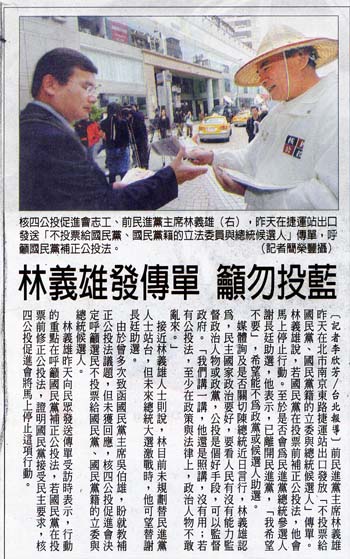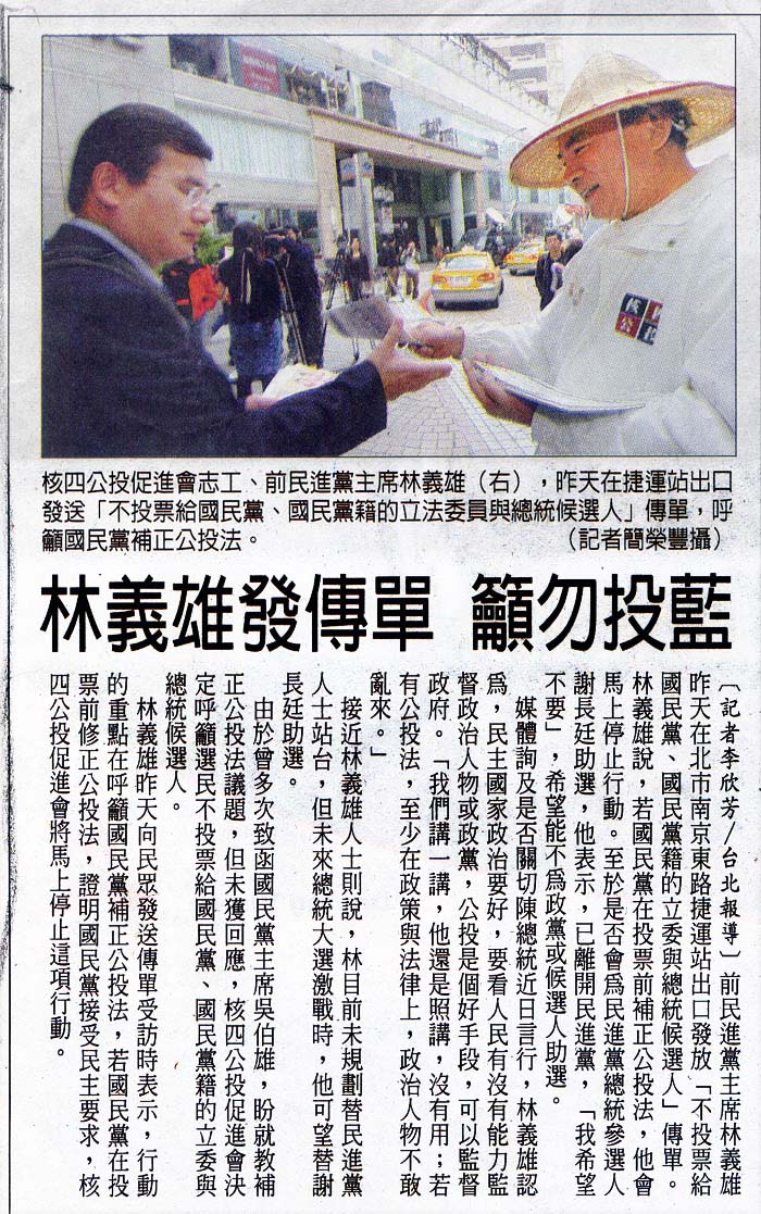 2007.12.19自由時報 林義雄發傳單 籲勿投藍 |