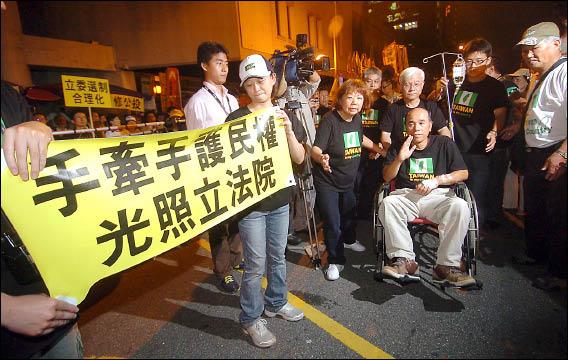 〔記者曾韋禎/台北報導〕台教會長蔡丁貴發起的公投法補正靜坐進入第七天,昨晚有上千位年輕網友及群眾手持手電筒來光照立法院,身體已極虛弱的蔡丁貴,乘坐輪椅繞行立院一圈後,依約前往台大醫院檢查身體。蔡丁貴盼望年輕人接手此活動,並呼籲民眾繼續堅守,抗議陳雲林來訪,讓世人知道台灣並不屬於中國。