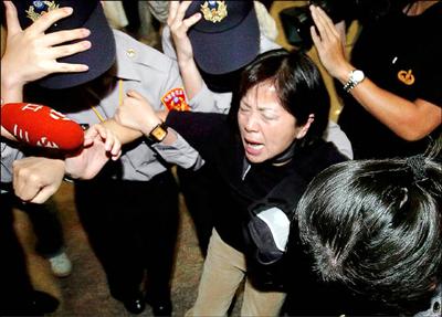 中國海協會會長陳雲林昨天來台,一名婦人在中國記者團進入機場入境大廳時,拿出標語高喊:「台灣不是中國的一部分」,隨即遭警方強制架離,她仍大聲高呼:「我是驕傲的台灣人」。 (記者朱沛雄攝)