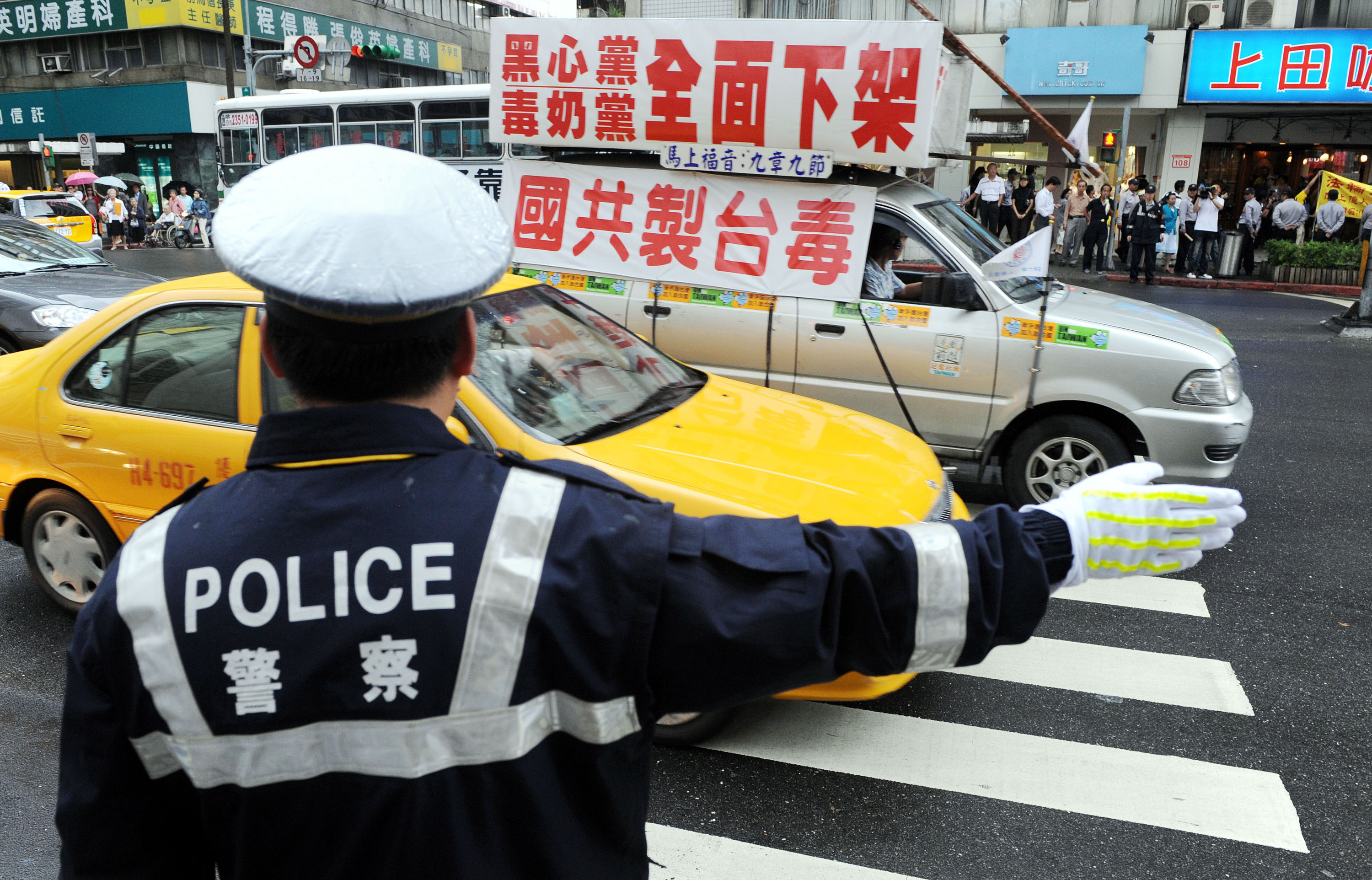 陳雲林3日下午前往台泥大樓拜訪前海基會董事長辜振甫遺孀辜嚴倬雲,貼有抗議黑心標語的車,在中山北路快車道來回嗆聲,警方也無可奈何。