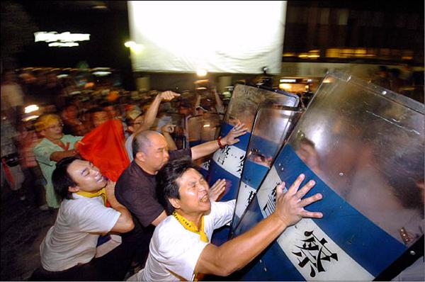 抗議陳雲林的群眾和警方昨在晶華酒店前爆發數起衝突,多人受傷掛彩,警方以優勢警力在街頭驅趕民眾。