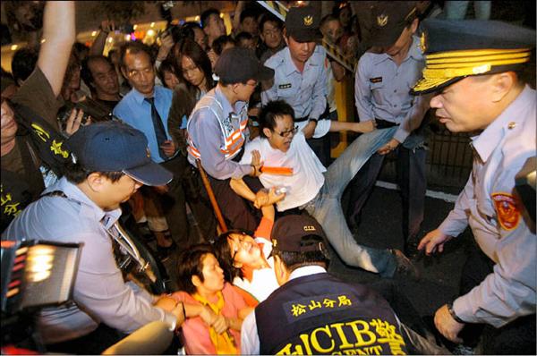 抗議陳雲林的群眾和警方昨在晶華酒店前爆發數起衝突,多人受傷掛彩,警方以優勢警力在街頭驅趕民眾。 (記者鹿俊為、叢昌瑾、朱沛雄攝)