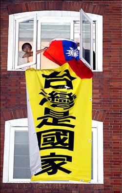 六點廿分,人潮愈聚愈多,有西藏人士在酒店外表演行動劇,民進黨青年部主任趙天麟等人租下老爺酒店十樓的房間懸掛「台灣是國家」的巨幅布條,並在窗口揮舞國旗,引發熱烈鼓掌喝采!