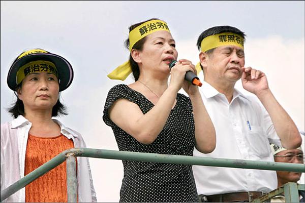 蘇治芬的長兄蘇治灝、胞妹蘇治宇、蘇勳璧則站在抗議隊伍前,說明蘇治芬為何拒絕交保,並感謝群眾的支持,蘇治宇不禁掉淚,蘇勳璧則高唱「黃昏的故鄉」,以歌聲向司法抗議,現場更貼滿「拒絕交保、還我清白」、「政治清算」、「藍色恐怖、綠色該死」的抗議標語。