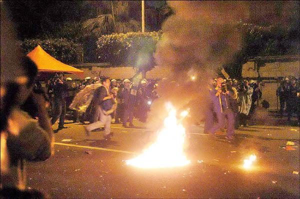 丟汽油彈/二○○四年四月十日,國親民眾於總統府前丟擲汽油彈,爆發嚴重衝突。 (資料照,葉志明攝)