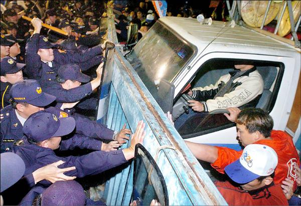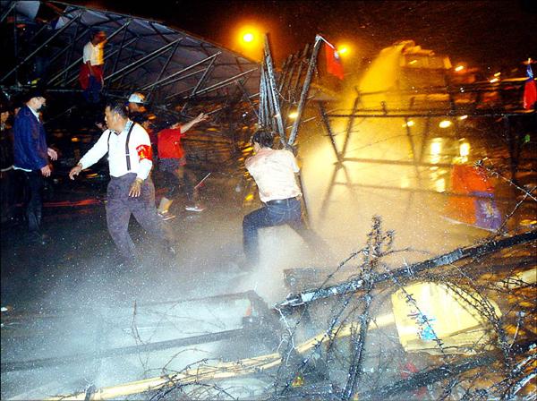強推拒馬/二○○四年四月十日,國親部份民眾拉扯拒馬,警方以強力水柱驅散。 (資料照,記者方賓照攝)