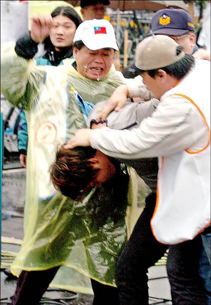 怒打綠民/二○○四年三月二十四日,一名男子向要求重新驗票的國親民代丟擲雞蛋,馬上被國親激情群眾趁亂圍毆。 (資料照,記者鹿俊為攝)
