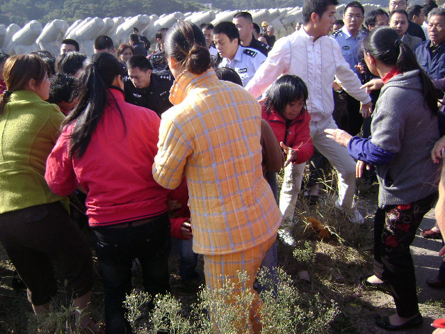 11日凌晨,狀元嶴村一位張姓村民被公安破窗而入抓走,被抓捕村民至今下落不明。該村村民陳女士說:「10日早上9點左右,幾十名婦女來到鄉政府討說法,當時鄉黨委書記故意脫身,被村民攔下他的車,他當即報警,趕來的公安與村民發生衝突,1名女村民被警察用手掐住肚子,用腳踢她肚子,她被打得半死,現在已被送到醫院治療。10點左右,洞頭縣派出300多名公安前來鎮壓。」