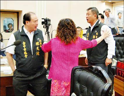 副議長陳天汶(左)與議員鄭功進(右)起口角,議員莊乃慧上前勸阻(上圖)。議員王岳彬穿上「台灣區公安」制服,諷刺警察淪為中國的台灣區公安(右圖)。