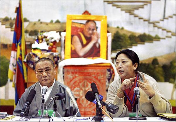 西藏流亡政府總理顙東仁波切(左)與西藏流亡議會副議長嘉里卓瑪(右),在記者會上接受記者提問。 (法新社)